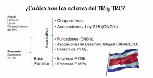 Incluye también todos los actores del Turismo Rural Comunitario se encuentran bajo una figura jurídica, entre ellas: Las cooperativas (Ley 4179 del 22 de agosto de 1968 y sus reformas) y las asociaciones que se integran bajo la ley 218 del 8 de agosto de 1939. Adicionalmente, la Cámara de Experiencias Rurales sostiene que deberán considerarse las Fundaciones (Ley 5338 del 28 de agosto de 1973 y sus reformas), también llamas Organizaciones no Gubernamentales, las asociaciones DINADECO (Ley 3859 del 7 de abril de 1967) (siempre y cuando tengan un giro dentro de su estructura del turismo), y los consorcios pymes turísticos